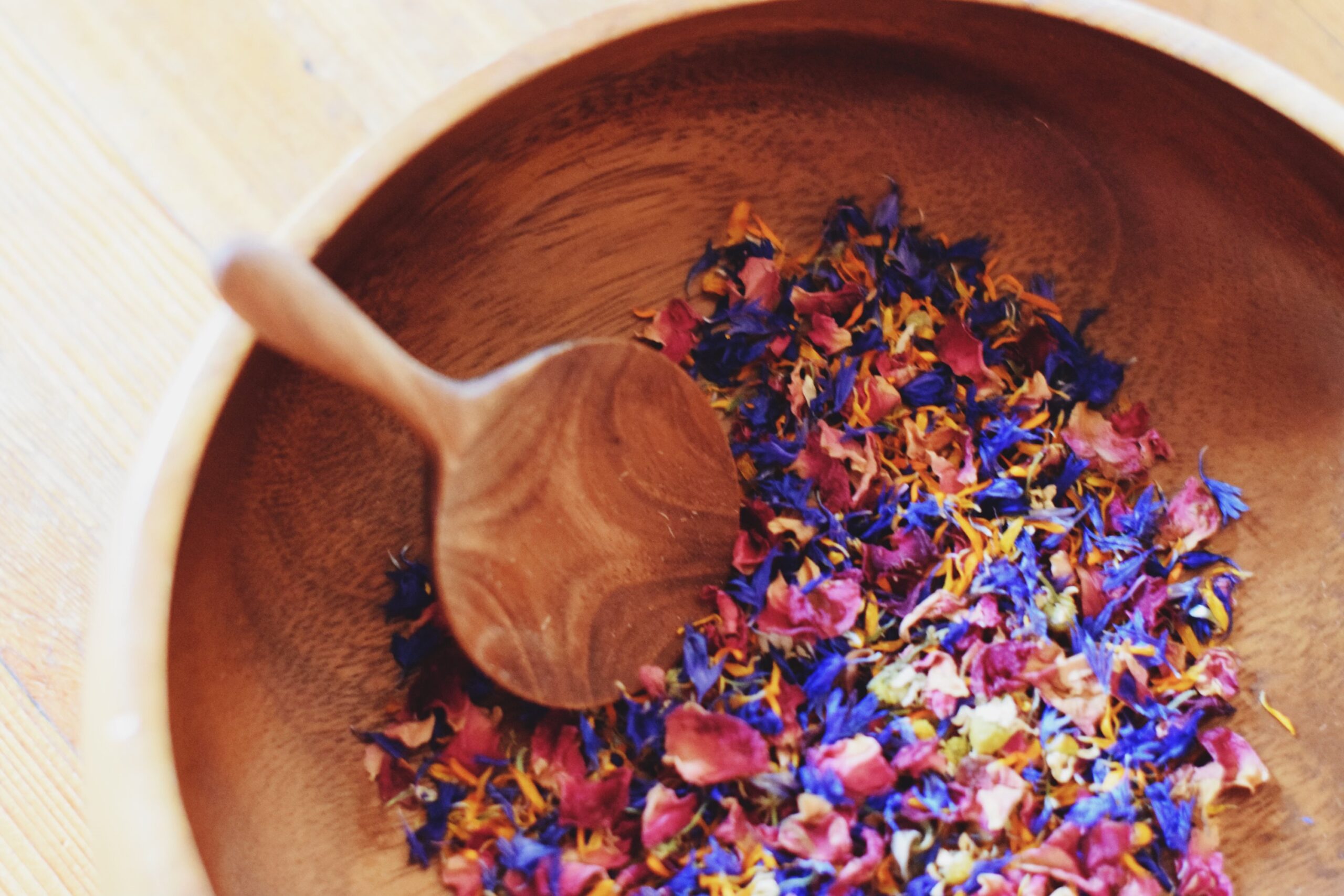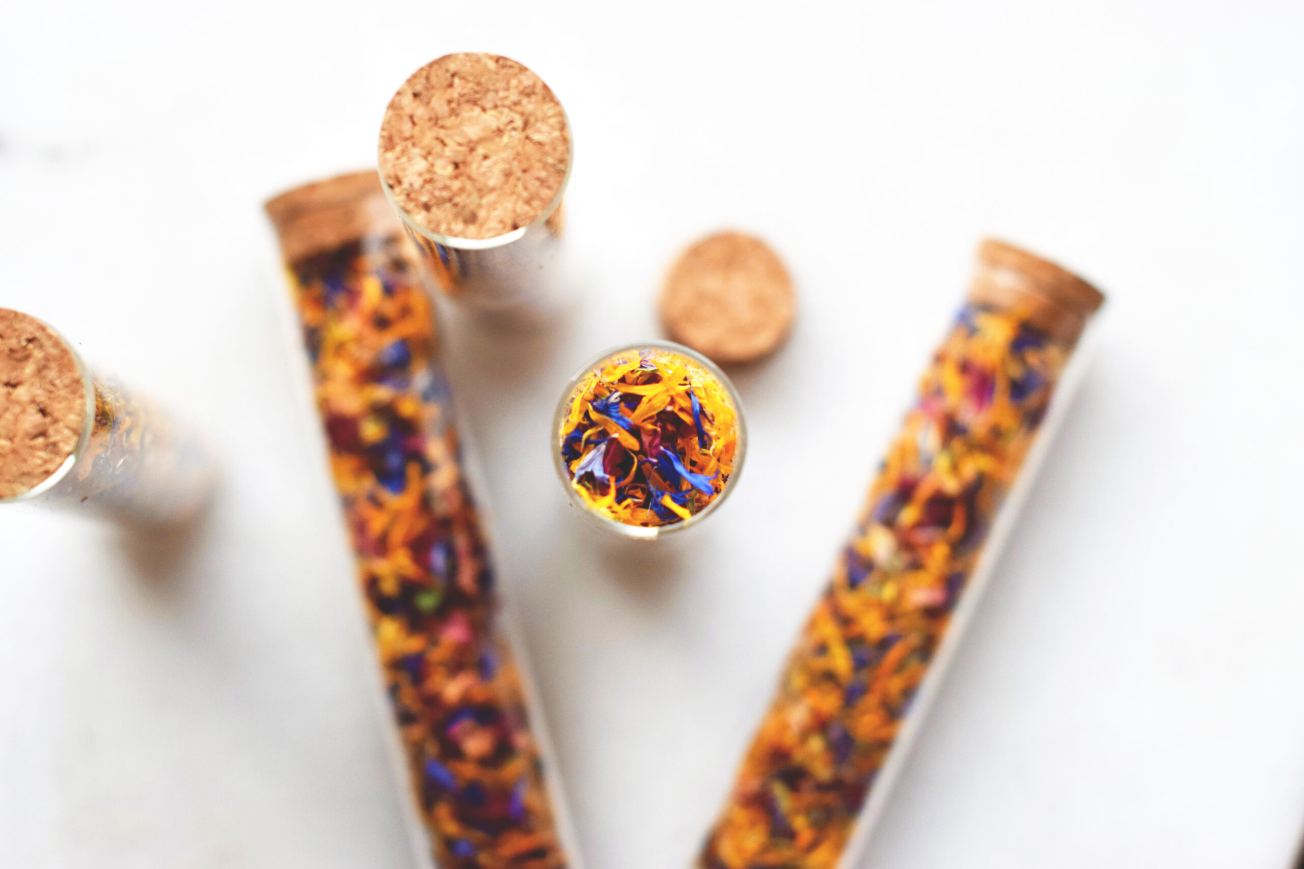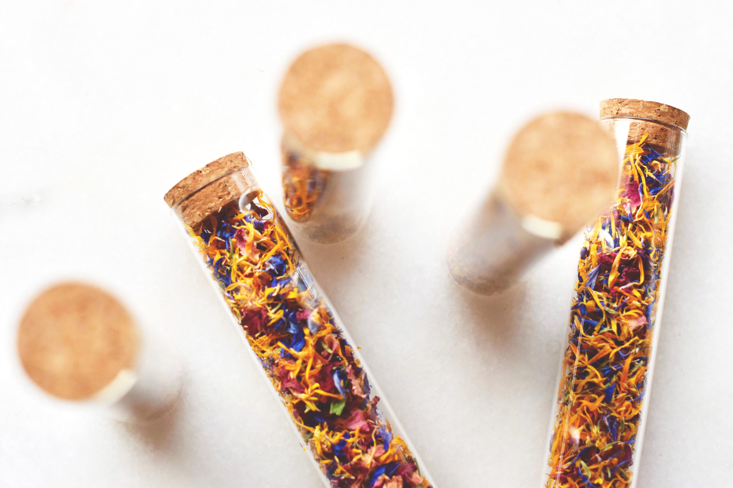Sprinkle some herbal magic on your daily oatmeal, fancy toast, or pancakes. Adorn cupcakes, cakes, or cookies; cocktails or mocktails; popsicles, ice cubes, or other frozen treats… Also makes a lovely biodegradable confetti. 3oz glass tube with cork lid